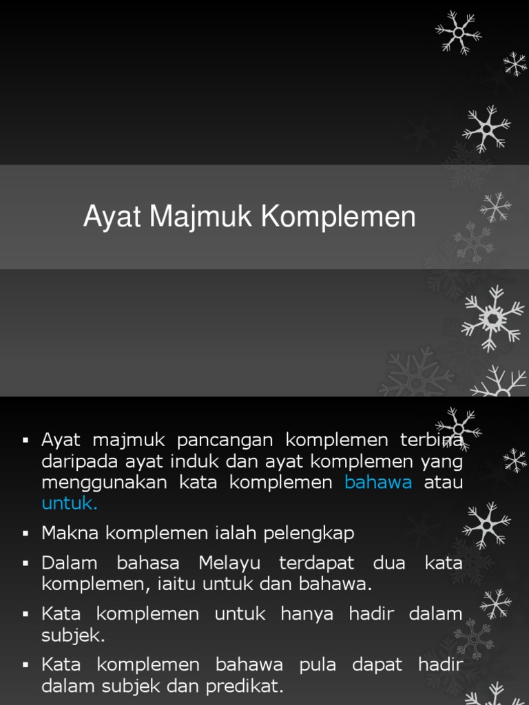 Ayat Majmuk Pancangan Komplemen - Ketua pengarah kesihatan mengumumkan bahawa.. Zulkarnain farihin philip 1.026 views5 months ago. 9 ayat majmuk pancangan komplemen terbina daripada ayat induk dan ayat komplemen yang menggunakan kata komplemen bahawa atau untuk seperti contoh yang berikut : Ayat majmuk pancangan ialah ayat yang mengandungi satu ayat induk dan satu atau beberapa ayat kecil lain yang dipancangkan ke dalam ayat induk dengan menggunakan kata hubung pancangan. Ayat majmuk komplemen ialah ayat utama yang dipancangkan dengan ayat kecil yang seterusnya menjadi komplemen kepada ayat utama. Remaja sekarang harus menghargai warisan budaya melayu.